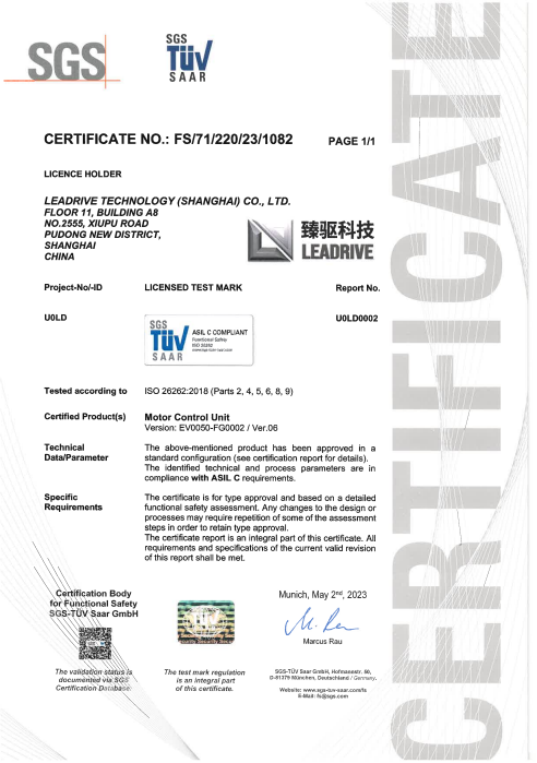 近日,國際權(quán)威第三方審核認(rèn)證機(jī)構(gòu)SGS為臻驅(qū)科技(上海)有限公司(以下簡稱“臻驅(qū)科技”)頒發(fā)ISO 26262:2018 ASIL C汽車功能安全產(chǎn)品認(rèn)證證書,該證書是臻驅(qū)科技獲得的首個功能安全產(chǎn)品認(rèn)證證書,也是繼2021年7月獲得“ISO 26262:2018 ASIL D汽車功能安全流程認(rèn)證證書”后,在汽車功能安全產(chǎn)品開發(fā)能力建設(shè)的又一重大里程碑。