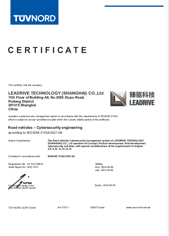 2024年5月11日,臻驅(qū)科技(上海)有限公司(以下簡(jiǎn)稱“臻驅(qū)科技”)正式通過(guò)《ISO/SAE 21434道路車輛-網(wǎng)絡(luò)安全工程》(以下簡(jiǎn)稱“ISO/SAE 21434”)汽車網(wǎng)絡(luò)安全管理體系認(rèn)證,獲得此證書標(biāo)志著臻驅(qū)科技已經(jīng)建立了完整的汽車網(wǎng)絡(luò)安全管理體系,具備了產(chǎn)品網(wǎng)絡(luò)安全開發(fā)和管理能力,是公司體系建設(shè)中又一關(guān)鍵里程碑。