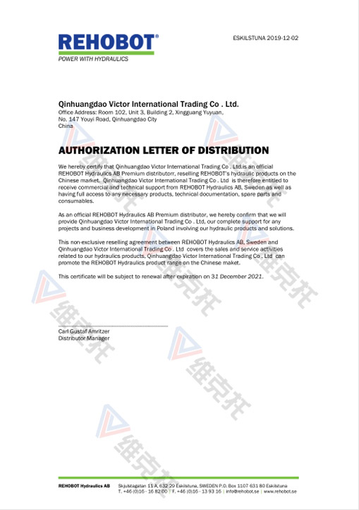 秦皇島維克多國際貿易有限公司于2019-12-02取得了REHOBOT中國代理授權,因此有權獲得瑞典REHOBOT液壓AB公司的商業和技術支持有充分的權利獲得任何必要的產品,技術文件,備件和耗材。